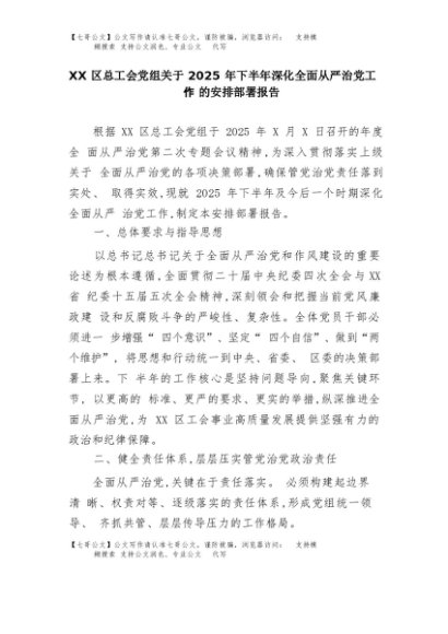 【七哥公文】2025年:XX区总工会党组关于2025年下半年深化全面从严治党工作的安排部署报告+更多免费公文+VX:QiGeGongWen2024