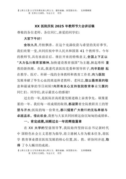 / 【七哥公文】2025年:XX医院庆祝2025年教师节大会讲话稿+更多免费公文+VX:QiGeGongWen2024