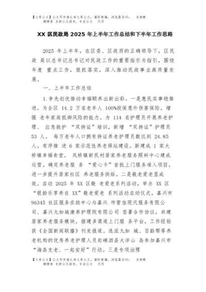 【七哥公文】2025年:XX区民政局2025年上半年工作总结和下半年工作思路+更多免费公文+VX:QiGeGongWen2024