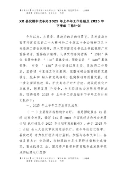 【七哥公文】2025年:XX县发展和改革局2025年上半年工作总结及2025年下半年工作计划+更多免费公文+VX:QiGeGongWen2024