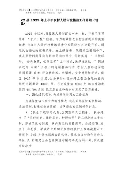 【七哥公文】2025年:XX县2025年上半年农村人居环境整治工作总结(精品)+更多免费公文+VX:QiGeGongWen2024
