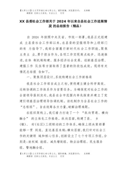 【七哥公文】2025年:XX县委社会工作部关于2024年以来全县社会工作进展情况的总结报告(精品)+更多免费公文+VX:QiGeGongWen2024
