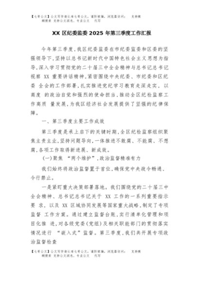 / 【七哥公文】2025年:XX区纪委监委2025年第三季度工作汇报+更多免费公文+VX:QiGeGongWen2024