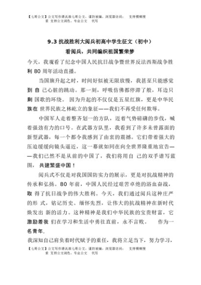 【七哥公文】2025年:9.3抗战胜利大阅兵初高中学生征文(初中)看阅兵共同编织祖国繁荣梦+更多免费公文+VX:QiGeGongWen2024