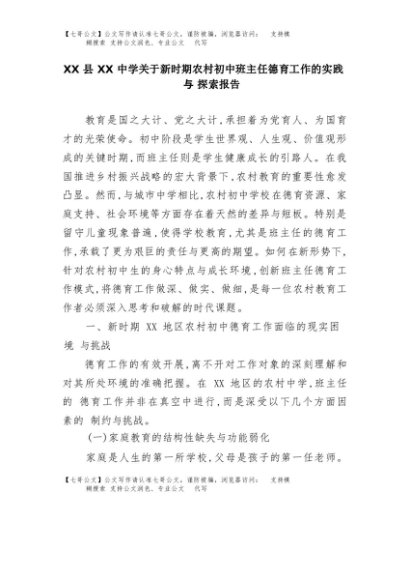 【七哥公文】2025年:XX县XX中学关于新时期农村初中班主任德育工作的实践与探索报告+更多免费公文+VX:QiGeGongWen2024