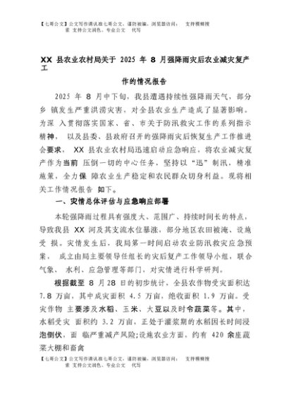 【七哥公文】2025年:XX县农业农村局关于2025年8月强降雨灾后农业减灾复产工作的情况报告+更多免费公文+VX:QiGeGongWen2024