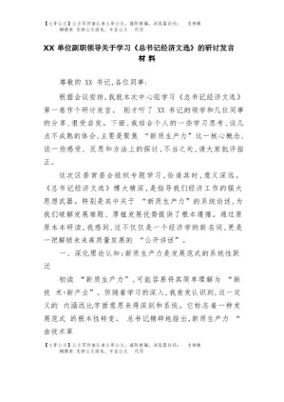 【七哥公文】2025年:XX单位副职领导关于学习《总书记经济文选》的研讨发言材料+更多免费公文+VX:QiGeGongWen2024