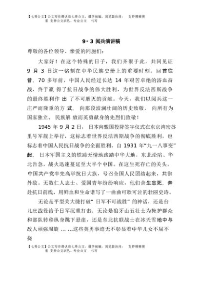 【七哥公文】2025年:9.3阅兵演讲稿+更多免费公文+VX:QiGeGongWen2024