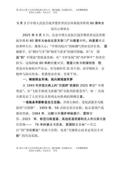 【七哥公文】2025年:9月3日中国人民抗日战争暨世界反法西斯战争胜利80周年大阅兵心得体会+更多免费公文+VX:QiGeGongWen2024
