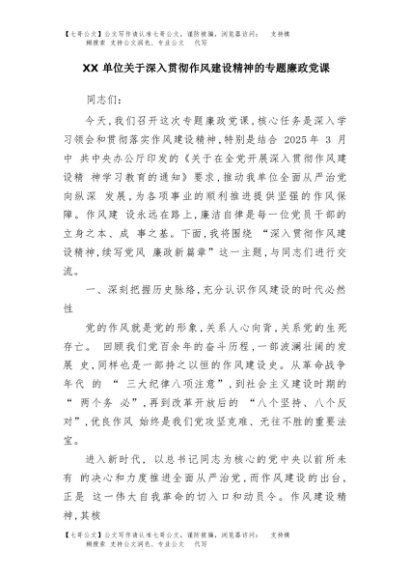 / 【七哥公文】2025年:XX单位关于深入贯彻作风建设精神的专题廉政党课+更多免费公文+VX:QiGeGongWen2024