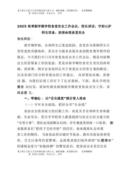 【七哥公文】2025年:2025秋季新学期学校食堂安全工作会议,校长讲话:守初心护师生饮食,担使命筑食堂安全+更多免费公文+VX:QiGeGongWen2024