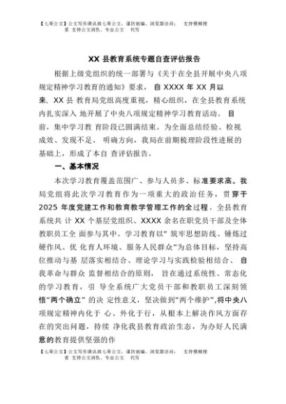 / 【七哥公文】2025年:XX县教育系统专题自查评估报告+更多免费公文+VX:QiGeGongWen2024