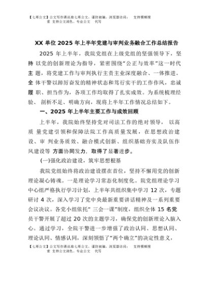 【七哥公文】2025年:XX单位2025年上半年党建与审判业务融合工作总结报告+更多免费公文+VX:QiGeGongWen2024