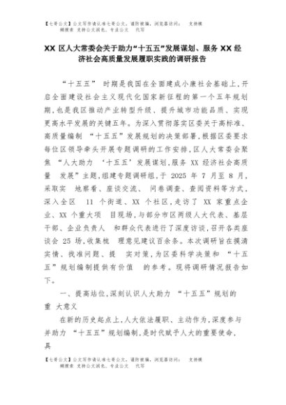 【七哥公文】2025年:XX区人大常委会关于助力“十五五”发展谋划、服务XX经济社会高质量发展履职实践的调研报告+更多免费公文+VX:QiGeGongWen2024