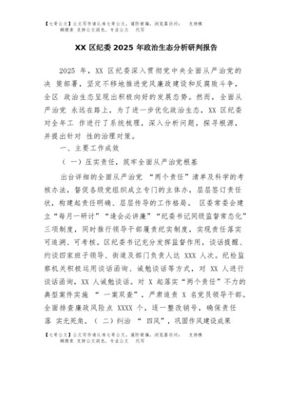 / 【七哥公文】2025年:XX区纪委2025年政治生态分析研判报告+更多免费公文+VX:QiGeGongWen2024