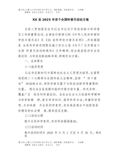 / 【七哥公文】2025年:XX县2025年首个全国科普月活动方案+更多免费公文+VX:QiGeGongWen2024