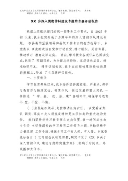 【七哥公文】2025年:XX乡深入贯彻作风建设专题的自查评估报告+更多免费公文+VX:QiGeGongWen2024