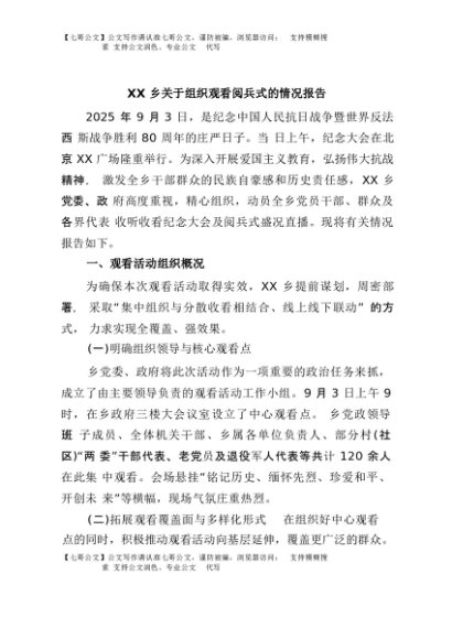 【七哥公文】2025年:XX乡关于组织观看阅兵式的情况报告+更多免费公文+VX:QiGeGongWen2024