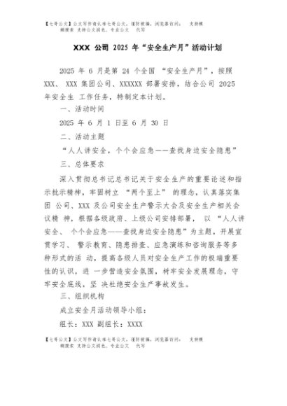 / 【七哥公文】2025年:XXX公司2025年“安全生产月”活动计划+更多免费公文+VX:QiGeGongWen2024