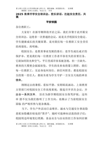 【七哥公文】2025年:2025秋季开学安全培训会,校长讲话:扛起安全责任,共筑平安校园+更多免费公文+VX:QiGeGongWen2024