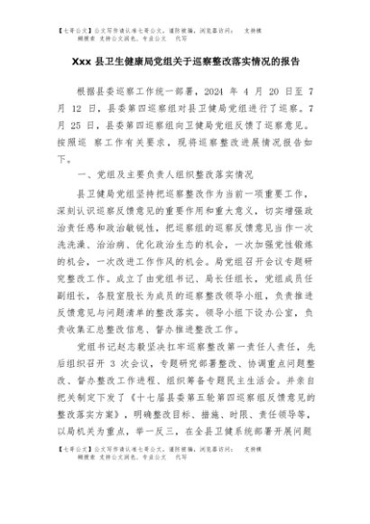 【七哥公文】2025年:Xxx县卫生健康局党组关于巡察整改落实情况的报告+更多免费公文+VX:QiGeGongWen2024