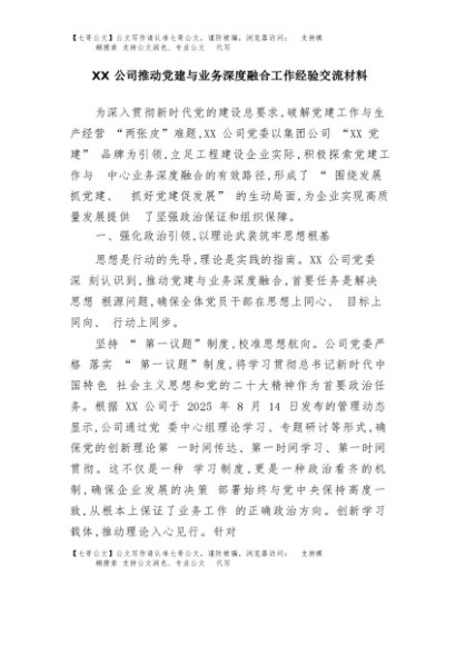 / 【七哥公文】2025年:XX公司推动党建与业务深度融合工作经验交流材料+更多免费公文+VX:QiGeGongWen2024