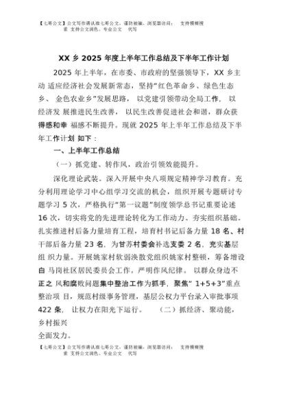 【七哥公文】2025年:XX乡2025年度上半年工作总结及下半年工作计划+更多免费公文+VX:QiGeGongWen2024