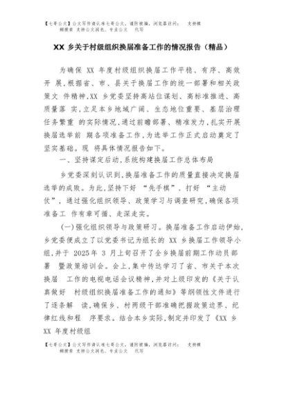 【七哥公文】2025年:XX乡关于村级组织换届准备工作的情况报告(精品)+更多免费公文+VX:QiGeGongWen2024