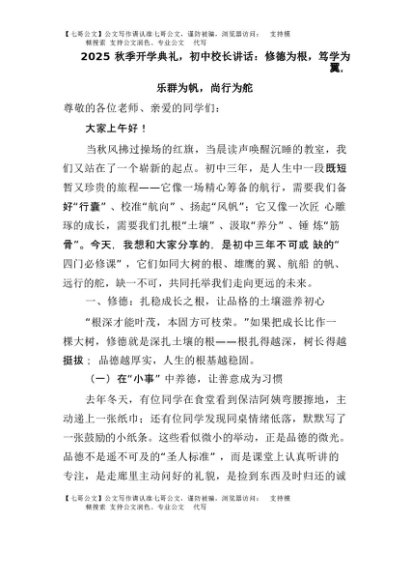 【七哥公文】2025年:2025秋季开学典礼,初中校长讲话:修德为根,笃学为翼,乐群为帆,尚行为舵+更多免费公文+VX:QiGeGongWen2024