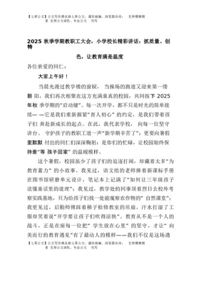 【七哥公文】2025年:2025秋季学期教职工大会,小学校长精彩讲话:抓质量、创特色,让教育满是温度+更多免费公文+VX:QiGeGongWen2024