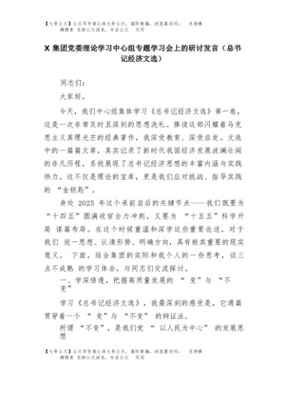 【七哥公文】2025年:Xxx集团党委理论学习中心组专题学习会上的研讨发言(总书记经济文选)+更多免费公文+VX:QiGeGongWen2024