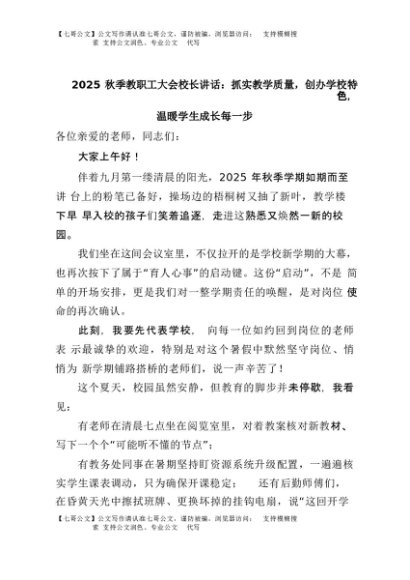 【七哥公文】2025年:2025秋季教职工大会校长讲话:抓实教学质量,创办学校特色,温暖学生成长每一步+更多免费公文+VX:QiGeGongWen2024