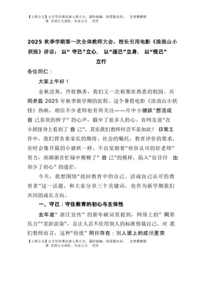 【七哥公文】2025年:2025秋季学期第一次全体教师大会,校长引用电影《浪浪山小妖怪》讲话:以 “守己” 立心,以 “适己” 立身,以 “悦己” 立行+更多免费公文+VX:QiGeGongWen2024
