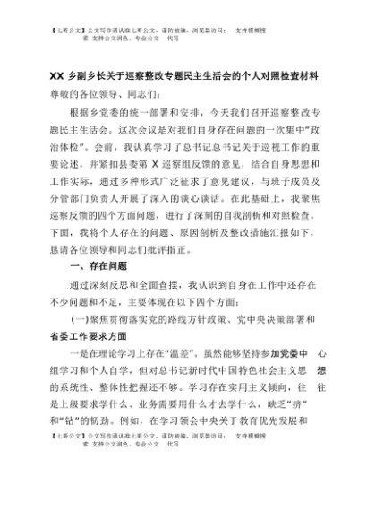 【七哥公文】2025年:XX乡副乡长关于巡察整改专题民主生活会的个人对照检查材料+更多免费公文+VX:QiGeGongWen2024