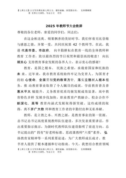 【七哥公文】2025年:2025年教师节大会致辞+更多免费公文+VX:QiGeGongWen2024
