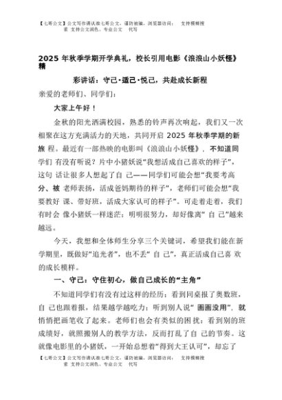 【七哥公文】2025年:2025年秋季学期开学典礼,校长引用电影《浪浪山小妖怪》精彩讲话:守己 适己 悦己,共赴成长新程+更多免费公文+VX:QiGeGongWen2024