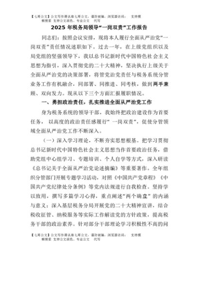 / 【七哥公文】2025年:2025年税务局领导“一岗双责”工作报告+更多免费公文+VX:QiGeGongWen2024
