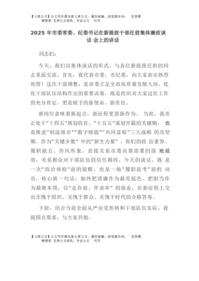 【七哥公文】2025年:2025年市委常委、纪委书记在新提拔干部任前集体廉政谈话会上的讲话+更多免费公文+VX:QiGeGongWen2024