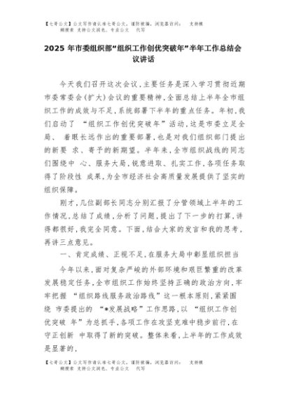 【七哥公文】2025年:2025年市委组织部“组织工作创优突破年”半年工作总结会议讲话+更多免费公文+VX:QiGeGongWen2024