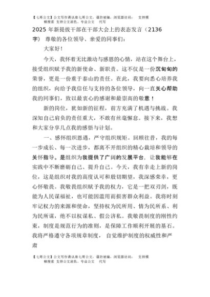 【七哥公文】2025年:2025年新提拔干部在干部大会上的表态发言(2136字)+更多免费公文+VX:QiGeGongWen2024