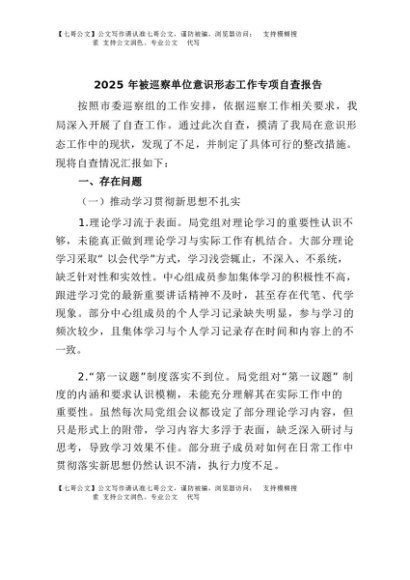 / 【七哥公文】2025年:2025年被巡察单位意识形态工作专项自查报告+更多免费公文+VX:QiGeGongWen2024