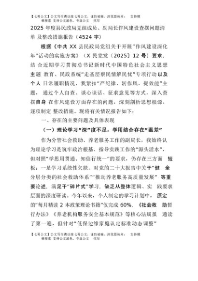 【七哥公文】2025年:2025年度县民政局党组成员、副局长作风建设查摆问题清单及整改措施报告(4524字)+更多免费公文+VX:QiGeGongWen2024
