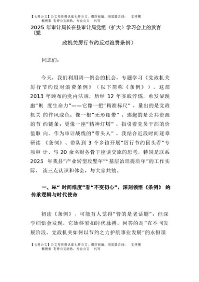 【七哥公文】2025年:2025年审计局长在县审计局党组(扩大)学习会上的发言(党政机关厉行节约反对浪费条例)+更多免费公文+VX:QiGeGongWen2024