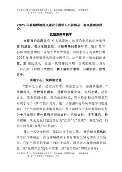 【七哥公文】2025年:2025年暑期师德师风建设专题学习心得体会;春风化雨沐师心,砥砺深耕育桃李+更多免费公文+VX:QiGeGongWen2024