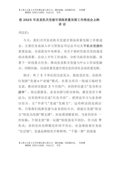 【七哥公文】2025年:2025年县直机关党建引领高质量发展工作推进会上的讲话+更多免费公文+VX:QiGeGongWen2024