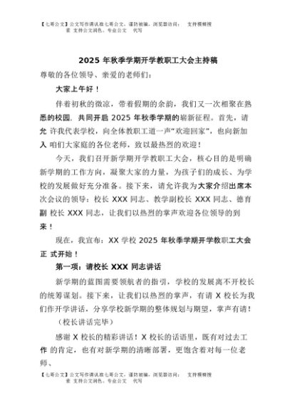 / 【七哥公文】2025年:2025年秋季学期开学教职工大会主持稿+更多免费公文+VX:QiGeGongWen2024