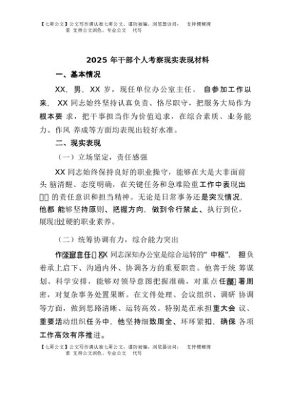 / 【七哥公文】2025年:2025年干部个人考察现实表现材料+更多免费公文+VX:QiGeGongWen2024
