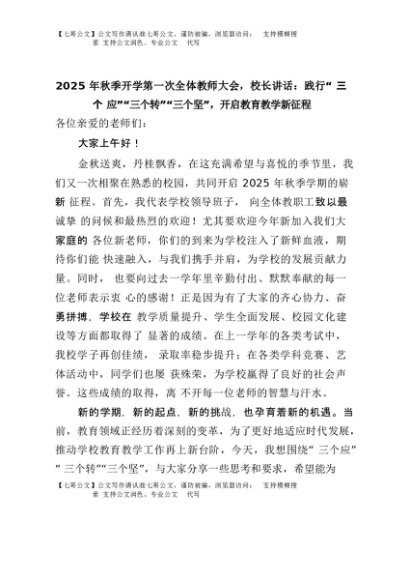 【七哥公文】2025年:2025年秋季开学第一次全体教师大会,校长讲话:践行 “三个应”“三个转”“三个坚” ,开启教育教学新征程+更多免费公文+VX:QiGeGongWen2024