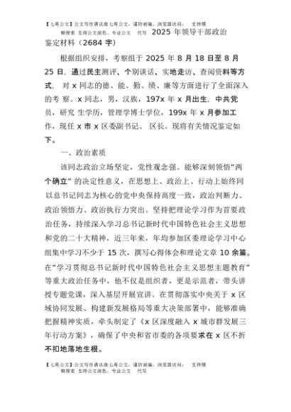 【七哥公文】2025年:2025年领导干部政治鉴定材料(2684字)+更多免费公文+VX:QiGeGongWen2024