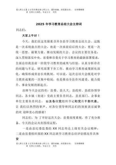 / 【七哥公文】2025年:2025年学习教育总结大会主持词+更多免费公文+VX:QiGeGongWen2024
